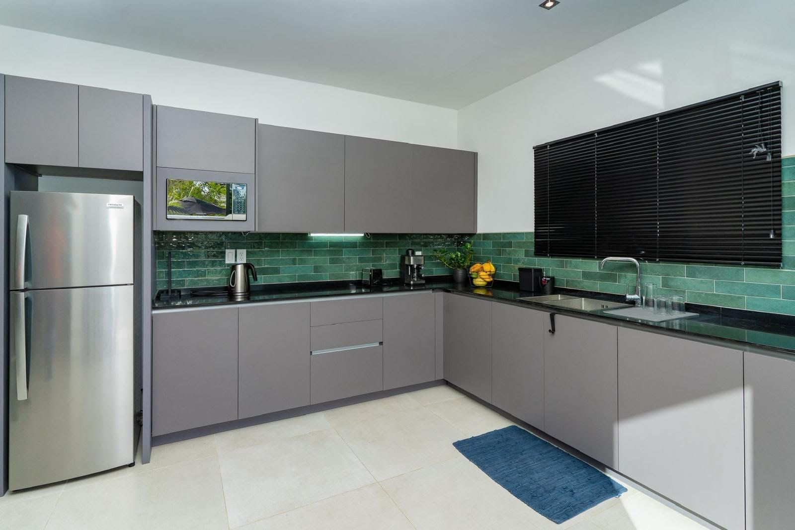 Gasfornuis, magnetron, koelkast, koffiezet apparaat, waterkoker, broodtoaster, servies, bestek, potten en pannen.